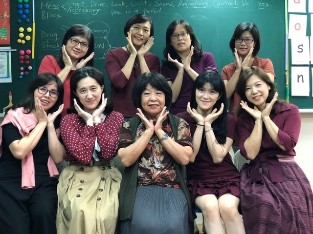 這學期的團體照要走什麼風格呢?Anita從二本繪本封面人物的服裝得到靈感,提出很好的建議,但囿於拍照要喬到大家共同空檔時間來完成,實屬有點難度,於是乎,最後決定就來個擇日不如撞日,直接下課前就拍了吧!